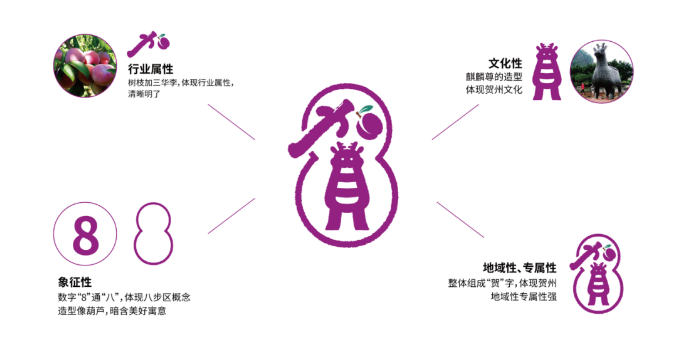 麒麟尊,出土于贺州的春秋战国时期青铜器,国家一级甲等文物,集中国古代神话传说中的龙、凤、麒麟三大神兽于一身。将麒麟尊融入到“贺”字中,进行艺术加工,抢占了文化原型同时为八步三华李赋予文化原力。